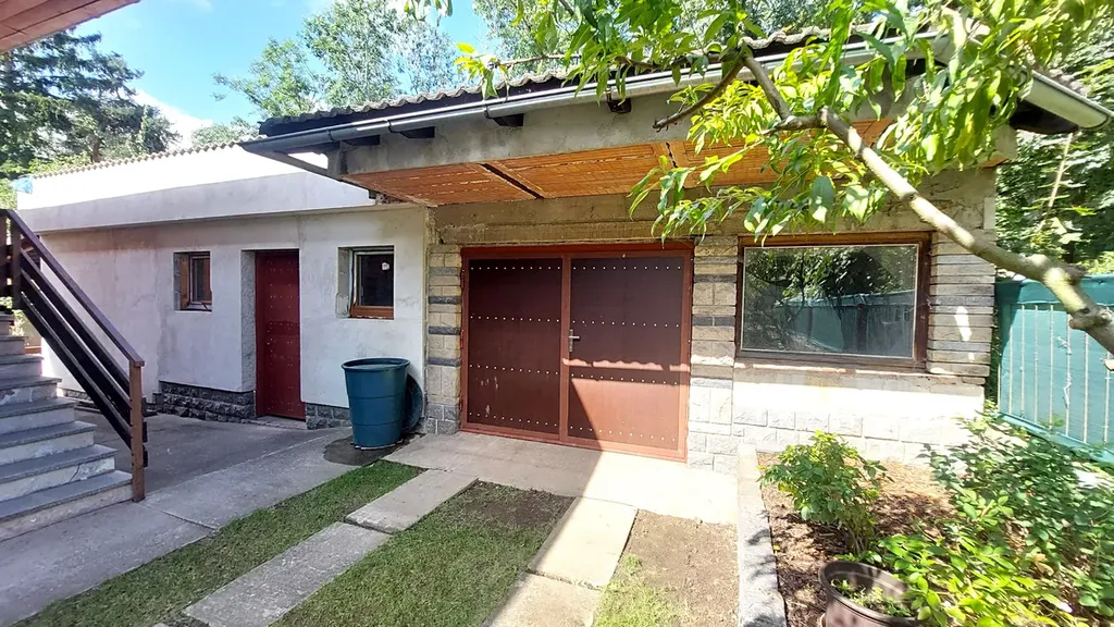 Na zahradě nedokončená stavba garáže a nebytových prostor (původně plánovaná dílna) o celkové podlahové ploše 58m² s velkým potenciálem využití, garáž až pro tři auta, dílna, fitness, sauna. ateliér apod.