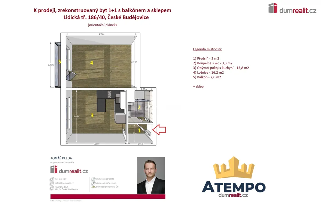 Dumrealit.cz Vám zprostředkuje prodej zrekonstruovaného bytu 1+1 s balkónem a sklepem v širším centru města České Budějovice, ul. Lidická tř. 186/40 (u Polikliniky Jih). Bytová jednotka se nachází ve 2. patře v zatepleném panelovém domě s výtahem. Byt je situovaný na východní světovou stranu a prošel kompletní rekonstrukcí v roce 2017. Náklady na provoz bytu činí 2.600,-Kč bez elektrické energie a internetu. V okolí je veškerá občanská vybavenost. Zajistíme Vám financování a veškerý právní servis. Více informací Vám poskytne realitní makléř Tomáš Pelda z realitní kanceláře A TEMPO fungující pod ochranou známkou dumrealit.cz. Ev. číslo: 655312.