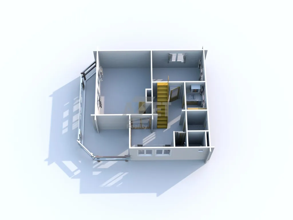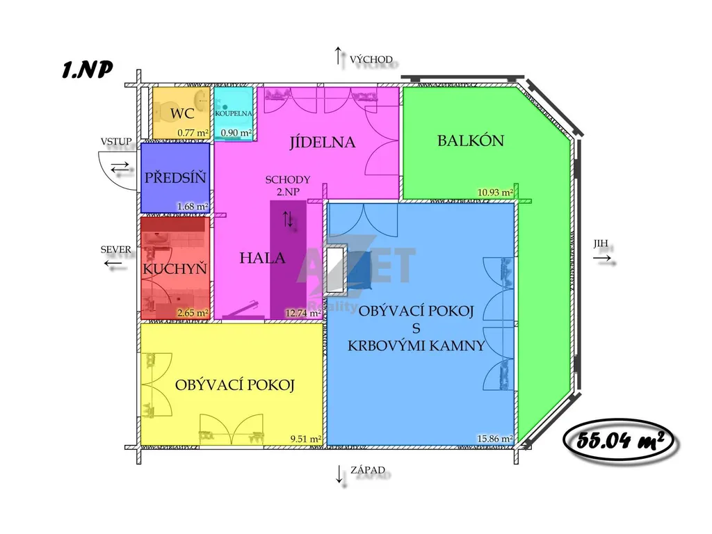 1.NP (55.04 m2) - předsíň, samostatné WC, koupelna, hala s jídelnou, kuchyně, balkón, obývací pokoj s krbovými kamny, další obývací pokoj, schodiště do 2.NP