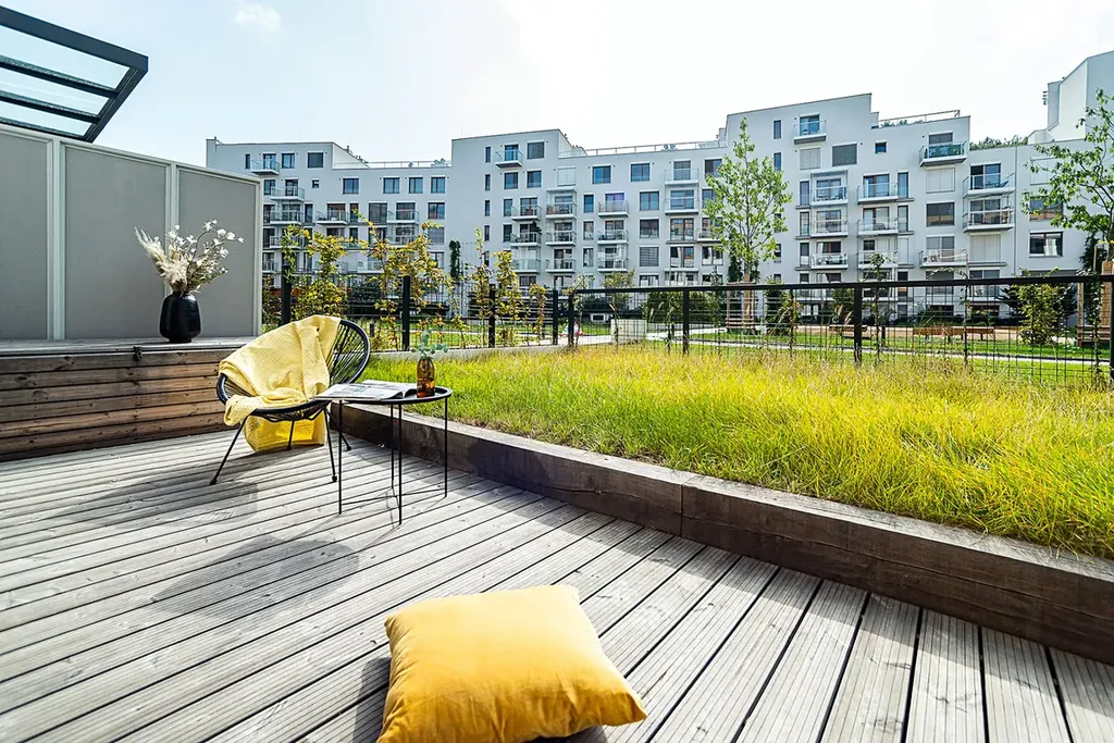 Byt disponuje podlahovou plochou 51,2 m2 a bezesporu obrovským benefitem je velkorysá předzahrádka s terasou o rozloze 35 m2 orientovaná do uzavřeného vnitrobloku s parkovou úpravou. Byt se pronajímá nezařízený nábytkem.
