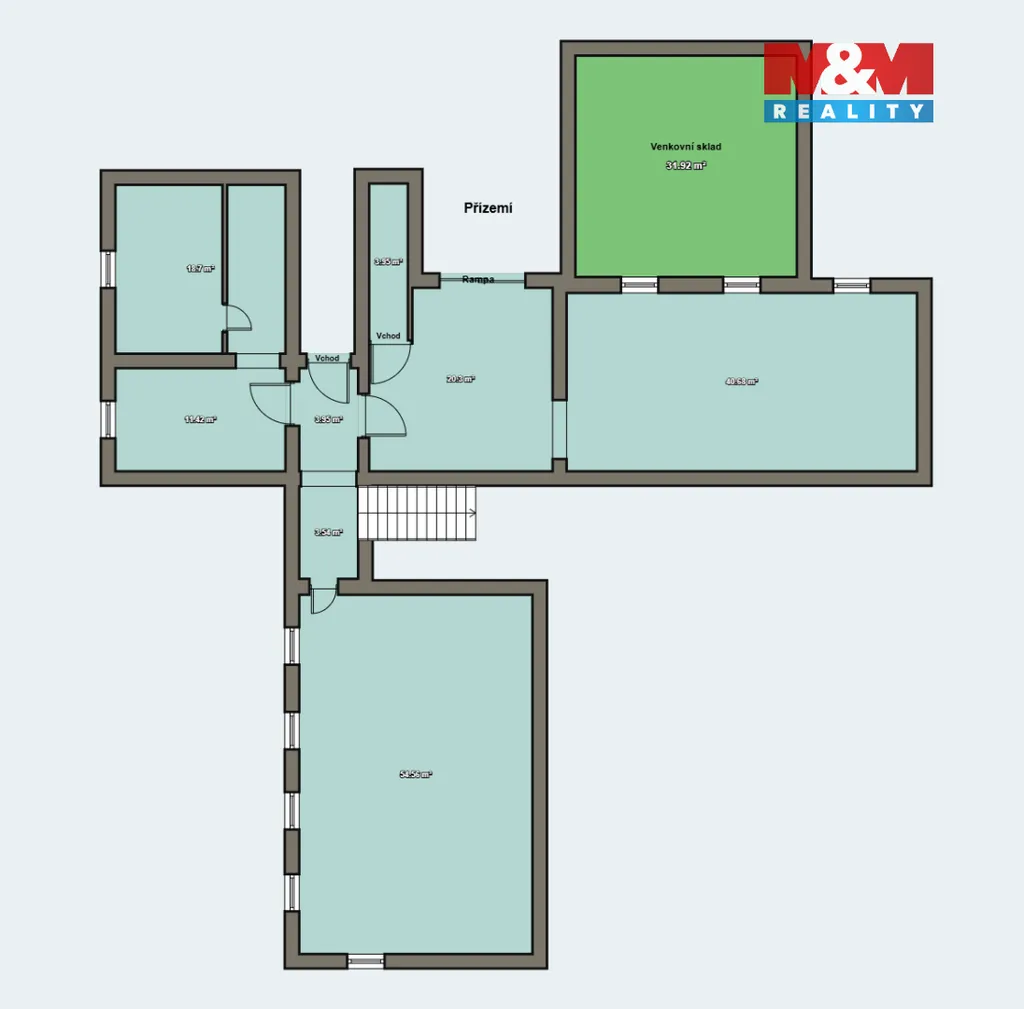 Přízemí: Nabízí variabilní prostory s odolnou podlahou, ideální pro lehkou výrobu nebo skladování. Klíčovým benefitem je možnost přímé nakládky z venkovní strany skrze nákladová vrata, což výrazně usnadňuje logistiku.