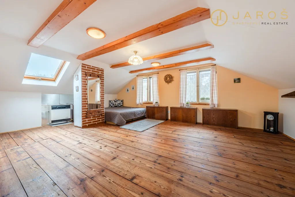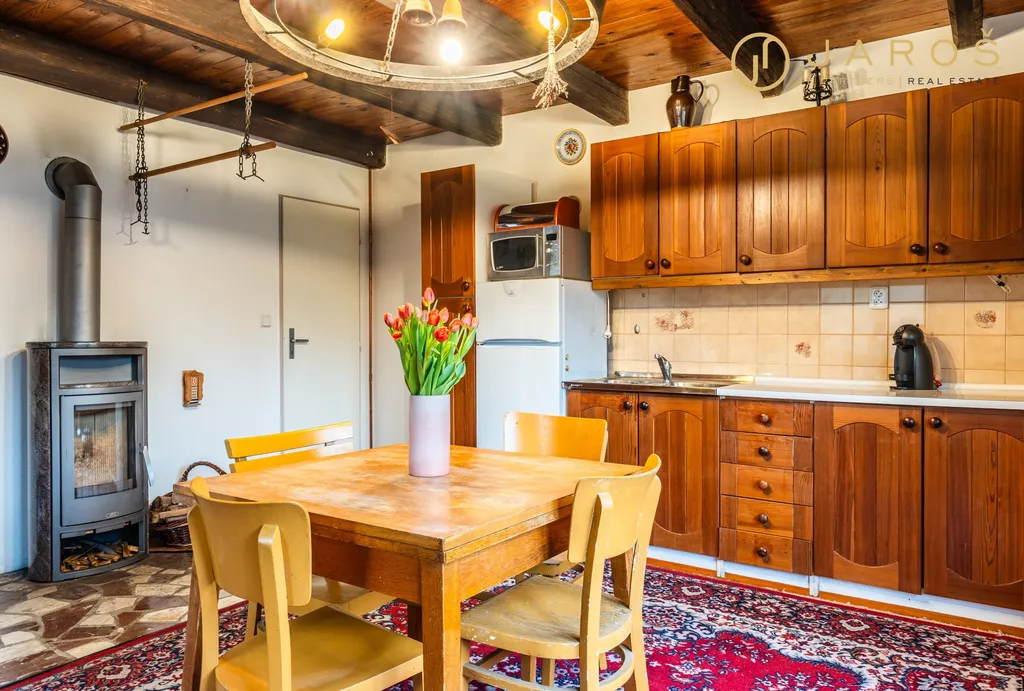 V přízemí se nachází prostorný obývací pokoj s kuchyňským koutem a krbovými kamny, dále samostatná koupelna a oddělené WC. V podkroví, kde byla odstraněna příčka, vznikl jeden velký otevřený pokoj. Ve spodní části domu je také k dispozici kůlna na dřevo, dílna a úložný prostor na nářadí. Nemovitost je napojena na veřejný vodovod, kanalizaci a plyn přičemž na pozemku se nachází také vlastní studna s užitkovou vodou. Vytápění je zajištěno plynovými kamny (WAW), a to jak v přízemí, tak i v podkroví domu.