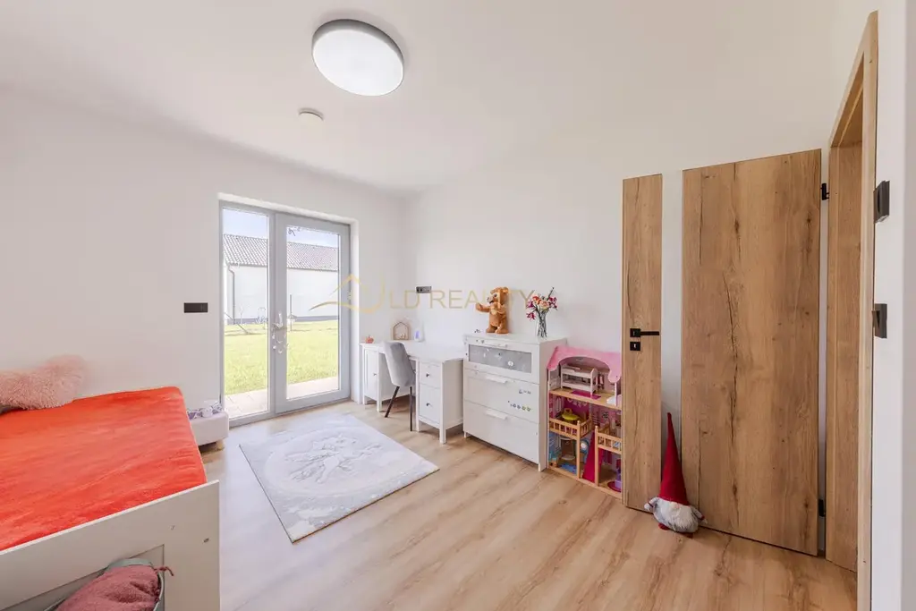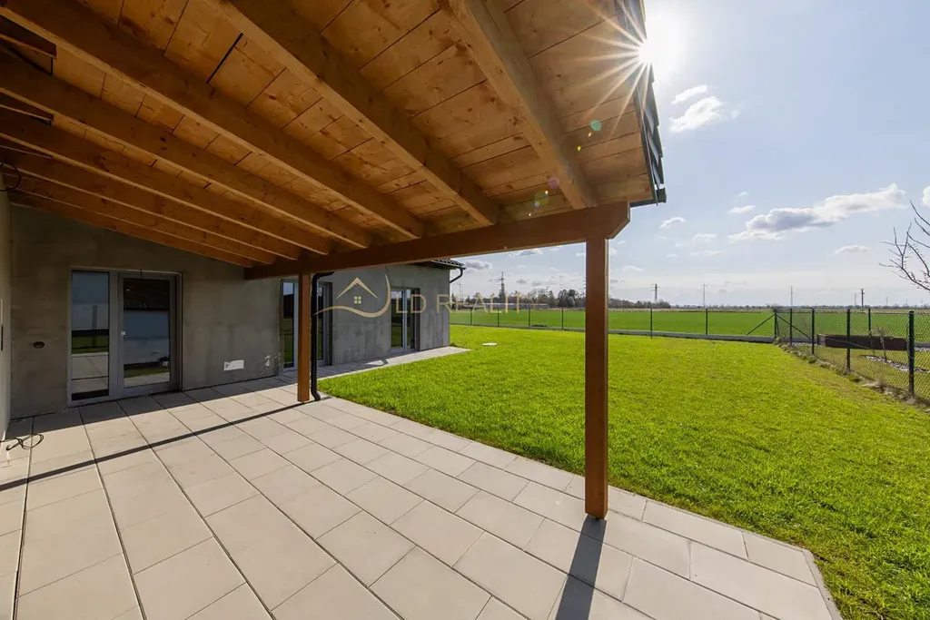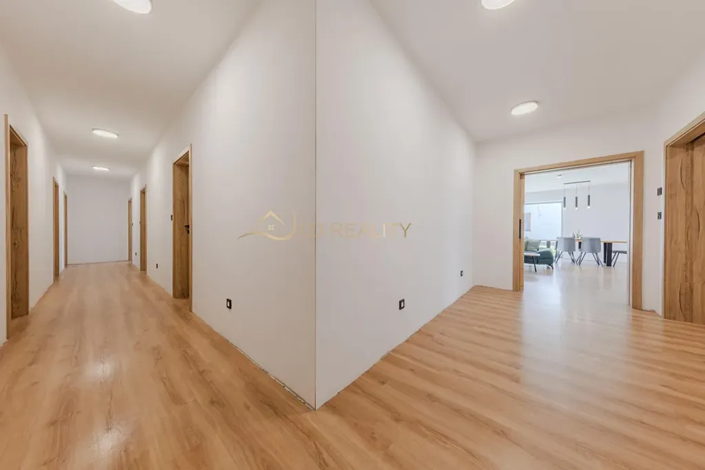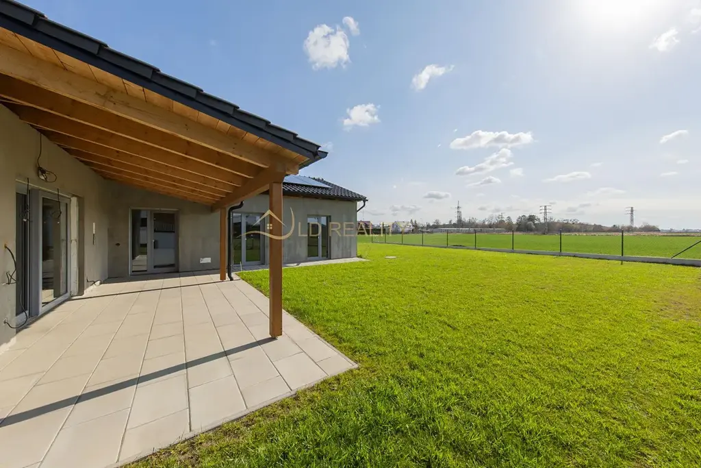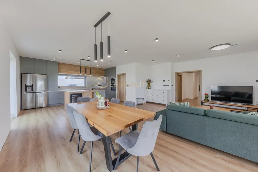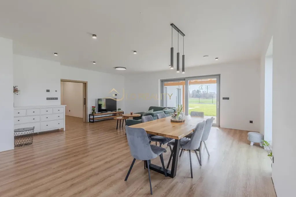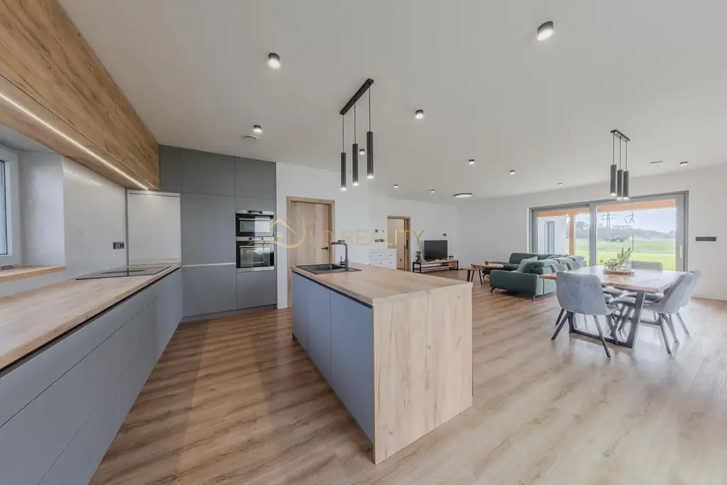 Celková zastavěná plocha činí 287 m and sup2;, celková plocha 250 m and sup2; a podlahová plocha domu je 199 m and sup2;. Dispozice 5+kk nabízí dostatek prostoru pro rodinné bydlení prostorný obývací pokoj s kuchyňským koutem o velikosti cca 58 m and sup2; s přímým vstupem na terasu, dále 4 samostatné pokoje, 2 šatny, 2 koupelny, 2 WC (z toho jedno samostatné), technickou místnost a praktickou spíž u kuchyně. Pokoje jsou orientovány na jihovýchod a jihozápad, což zajišťuje dostatek denního světla po celý den. Součástí domu je také garáž o velikosti 30 m and sup2; a parkovací plocha před domem pro dvě auta. Pozemek okolo domu nabízí výměru 515 m, je rovinatý a zatravněný.