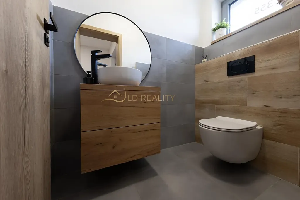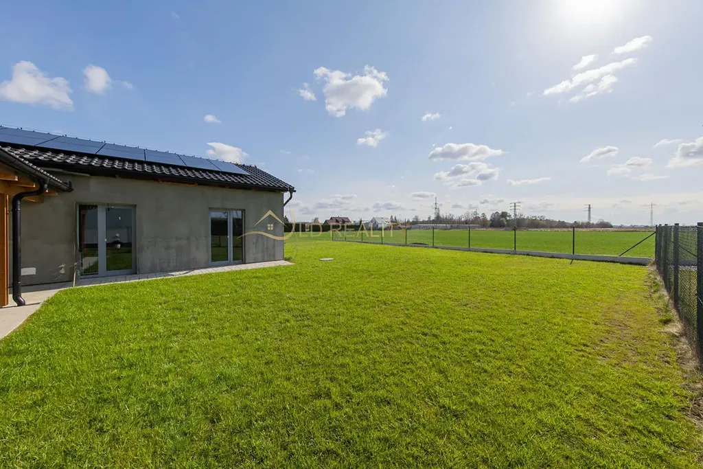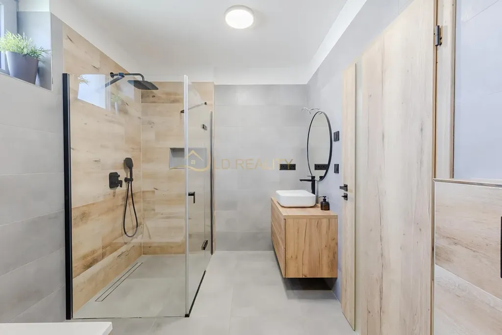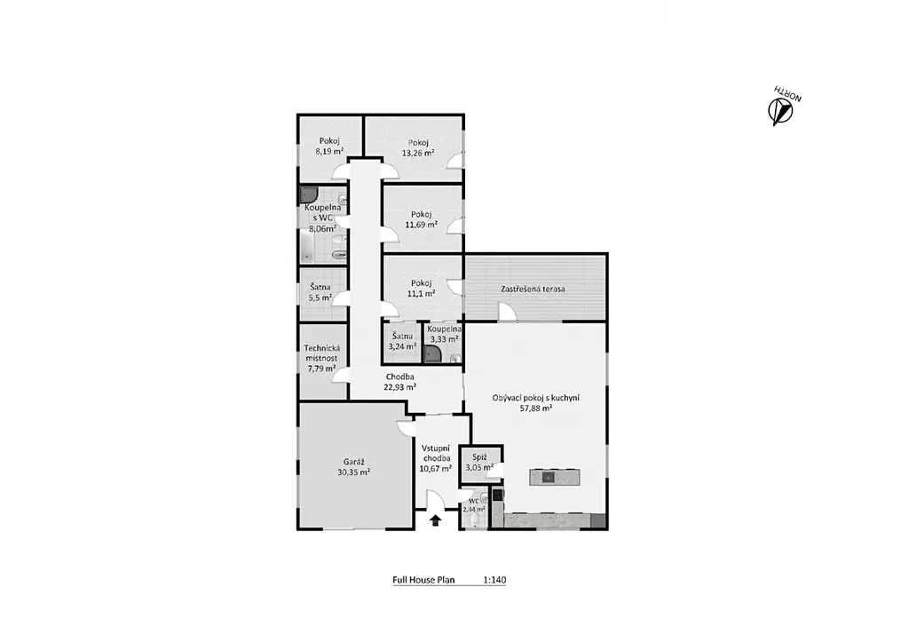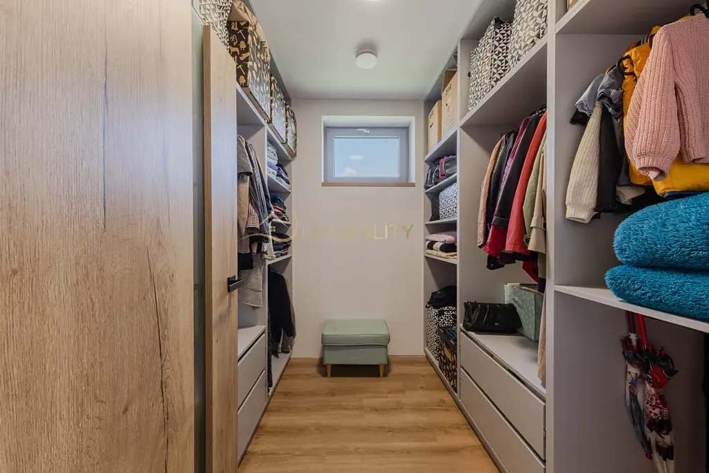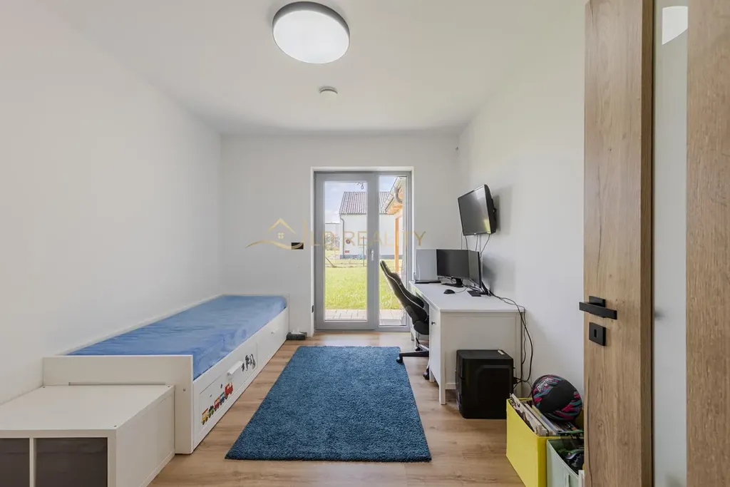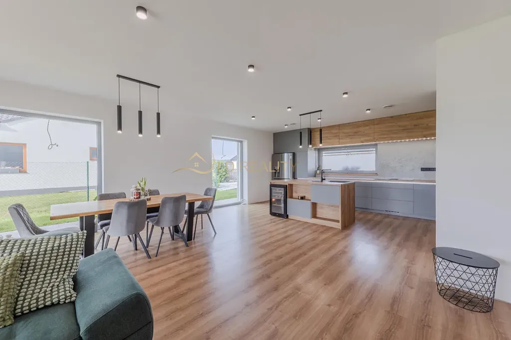 Celková zastavěná plocha činí 287 m and sup2;, celková plocha 250 m and sup2; a podlahová plocha domu je 199 m and sup2;. Dispozice 5+kk nabízí dostatek prostoru pro rodinné bydlení prostorný obývací pokoj s kuchyňským koutem o velikosti cca 58 m and sup2; s přímým vstupem na terasu, dále 4 samostatné pokoje, 2 šatny, 2 koupelny, 2 WC (z toho jedno samostatné), technickou místnost a praktickou spíž u kuchyně. Pokoje jsou orientovány na jihovýchod a jihozápad, což zajišťuje dostatek denního světla po celý den. Součástí domu je také garáž o velikosti 30 m and sup2; a parkovací plocha před domem pro dvě auta. Pozemek okolo domu nabízí výměru 515 m, je rovinatý a zatravněný.