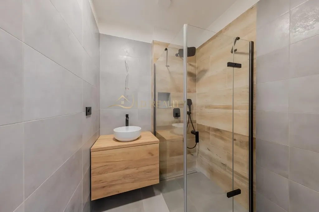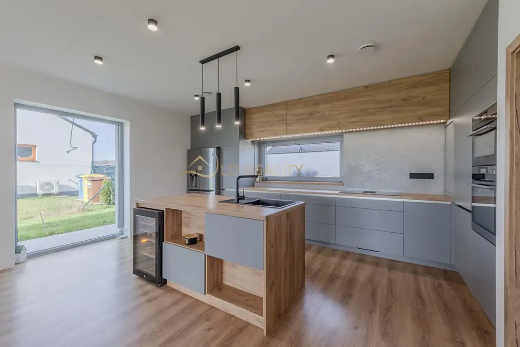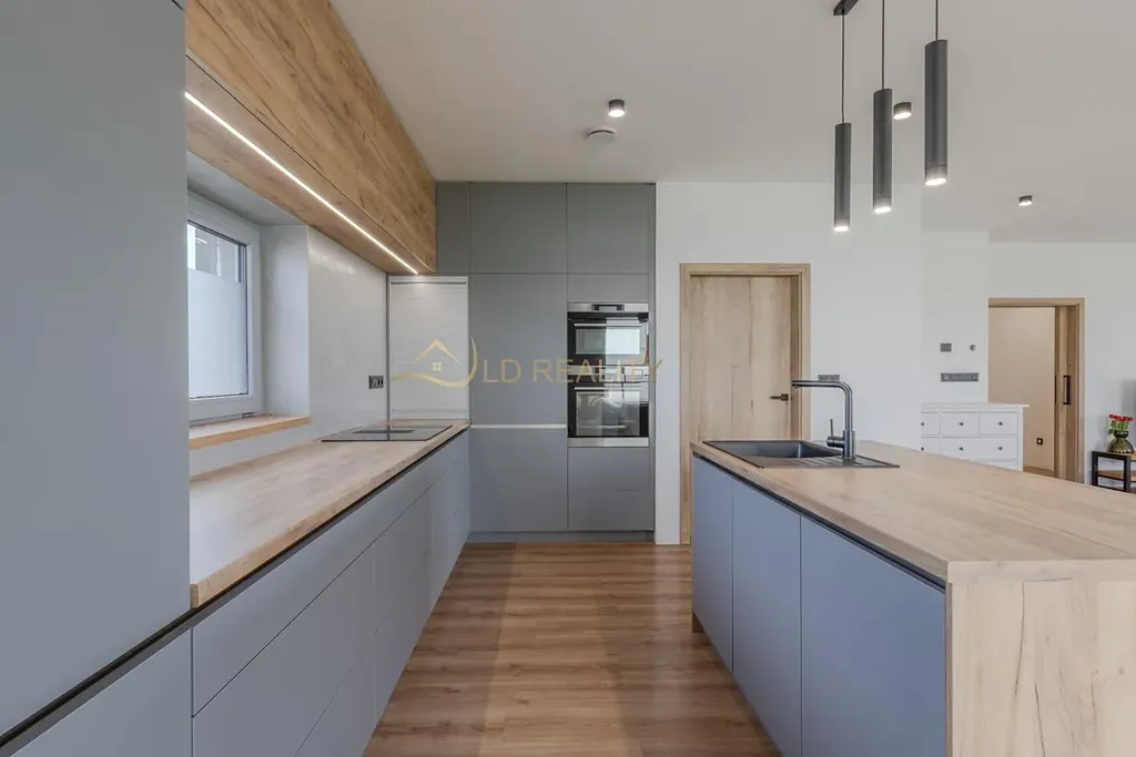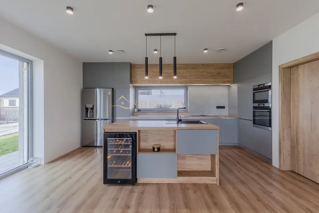 Moderní kuchyňská linka s ostrůvkem je součástí prodeje a je vybavena vestavěnými spotřebiči myčka nádobí, varná deska se zabudovaným odsavačem par, lednice s mrazákem, horkovzdušná trouba a mikrovlnná trouba.