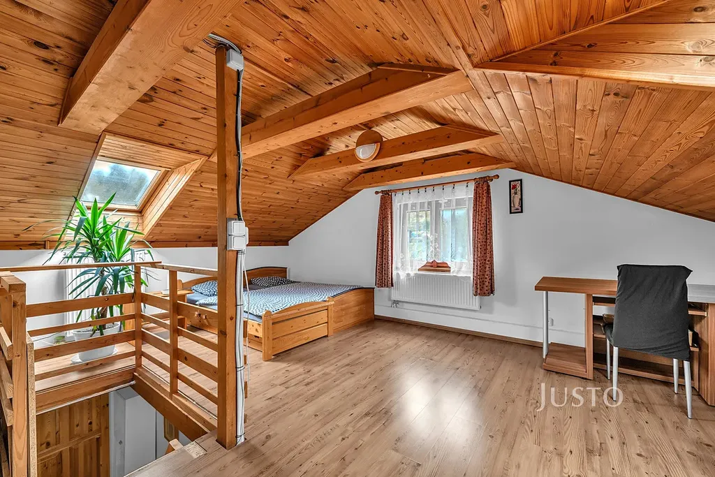 Dům je samostatně stojící, má tři nadzemní podlaží a je částečně vybaven. Interiér působí příjemně díky dřevěným prvkům, kvalitním podlahám a dostatku přirozeného světla. V přízemí najdete prostorný a prosvětlený obývací pokoj, jídelní kout a pracovní místo. V podkroví je otevřený prostor vhodný jako ložnice či další pracovna. Kuchyně je vybavena kuchyňskou linkou, plynovou varnou deskou, troubou a myčkou. V koupelně je k dispozici sprchový kout a v druhé koupelně, která se nachází v suterénu domu je vana. Součástí domu jsou také sítě proti hmyzu a eurookna zajišťující komfortní bydlení.