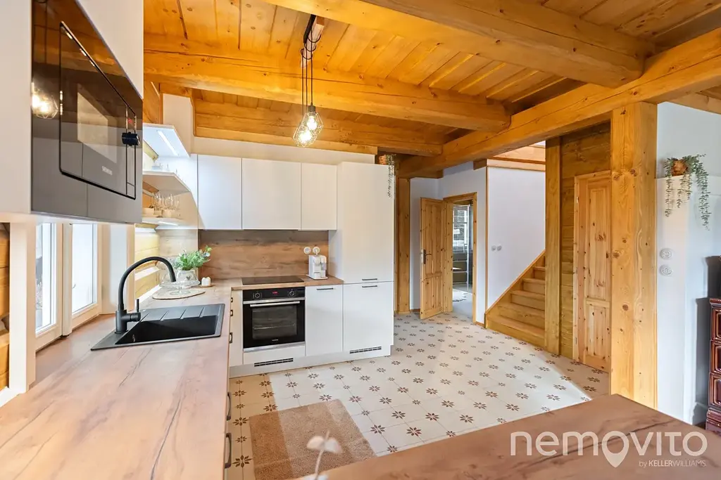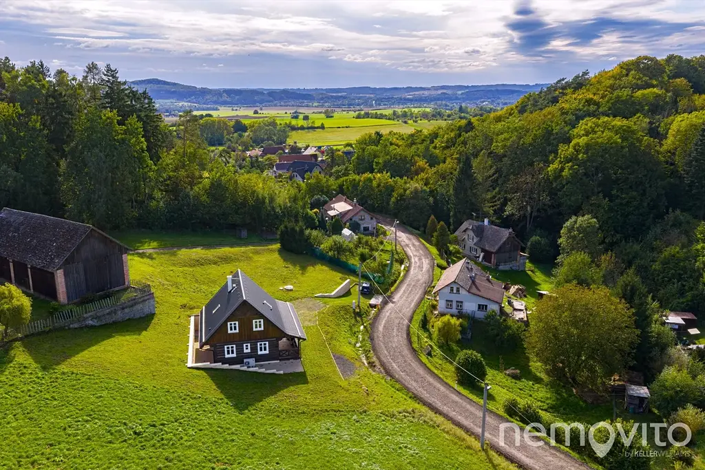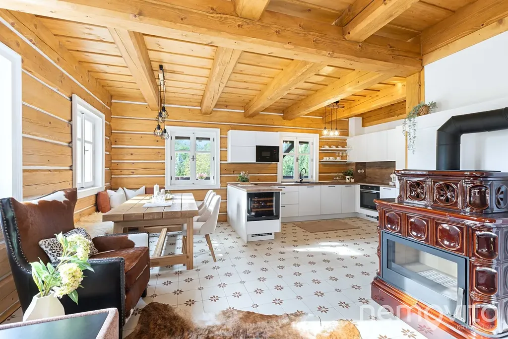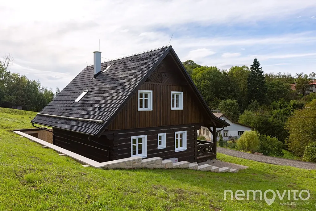 Zbrusu nová roubenka, která v sobě spojuje prvky tradičního stavitelství se soudobými poznatky a technologiemi. Stavba z masivních smrkových hranolů 30x30 cm je vytápěna tepelným čerpadlem a nechybí v ní ani sauna, kachlová kamna nebo špičková kuchyně s vestavěnou vinotékou. Vše v srdci Českého ráje, nedaleko hradu Trosky, v malé a klidné vesničce.