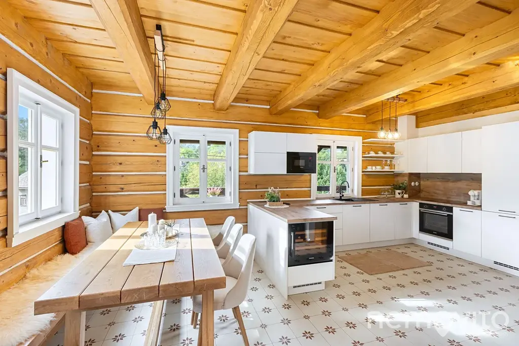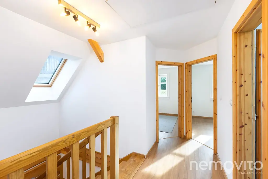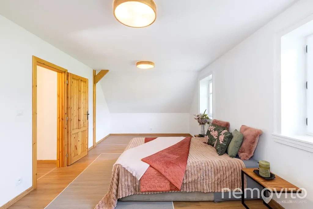 Ložnice mají 2x 12 m2, poslední pak 24 m2 a umožňuje rozdělení na dvě sekce. Vstupní zádveří domu (8 m2) nabízí prostor pro vestavěný nábytek a k dispozici je také technická místnost s místem na pračku a sušičku. V domě jsou použité kvalitní a osvědčené materiály (nejedná se o první roubenku majitele) - masivní dřevěné dveře, kvalitní spotřebiče, odolné nátěry. Vše je řešeno tak, aby bylo trvanlivé a bez investic v následujících letech.