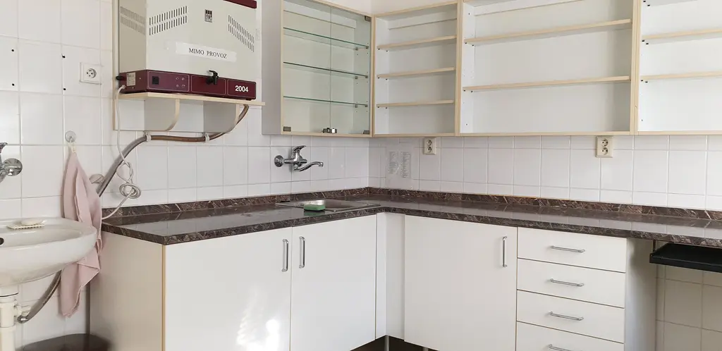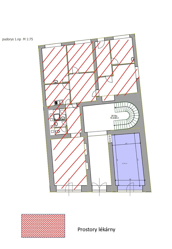Součástí prostoru k pronájmu s výkladem vchodem do ulice jsou dálle v zázemí i toalety, kuchňka, šatna a 3-4 daší ordinace případně sklady. Z objektu je možno vyjít i na zadní parkoviště.
