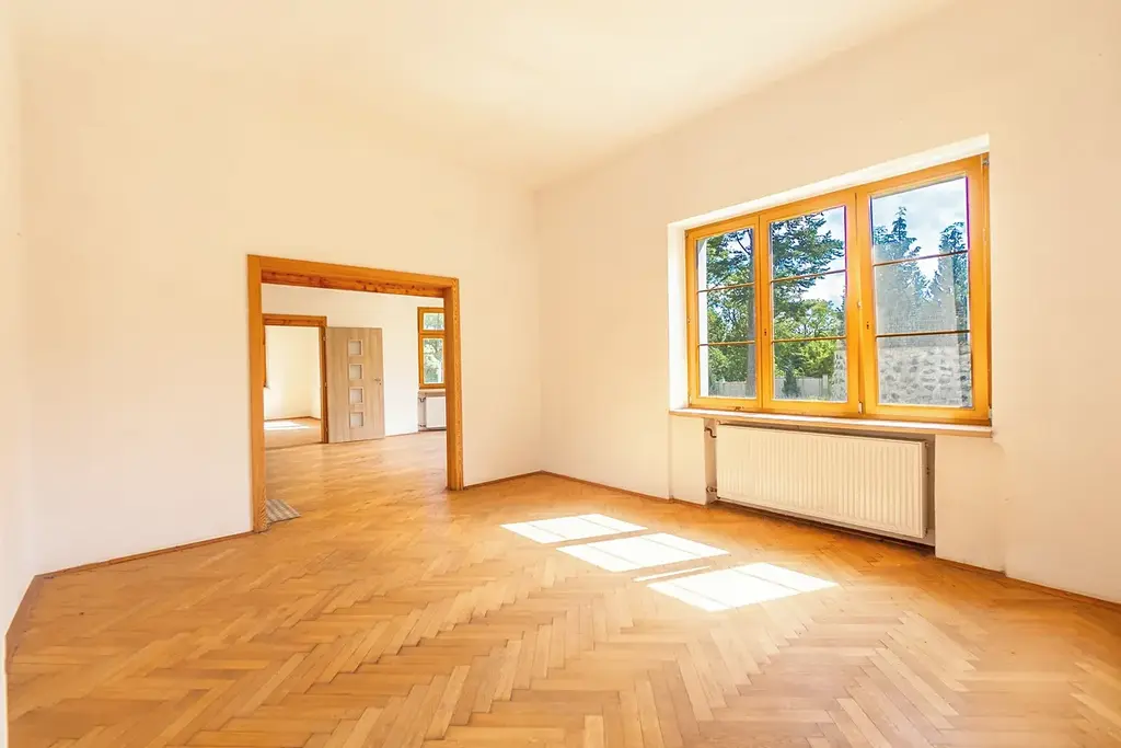 Podlahy z krásných dřevěných parket či masivního dřeva přispívají k teple a noblese celého domu, zatímco velká, rovná zahrada s fontánou zve k odpočinku, dětským hrám i společenským setkáním. Na pozemku je možné vybudovat parkovací stání nebo další venkovní prostředí podle vašich představ.
