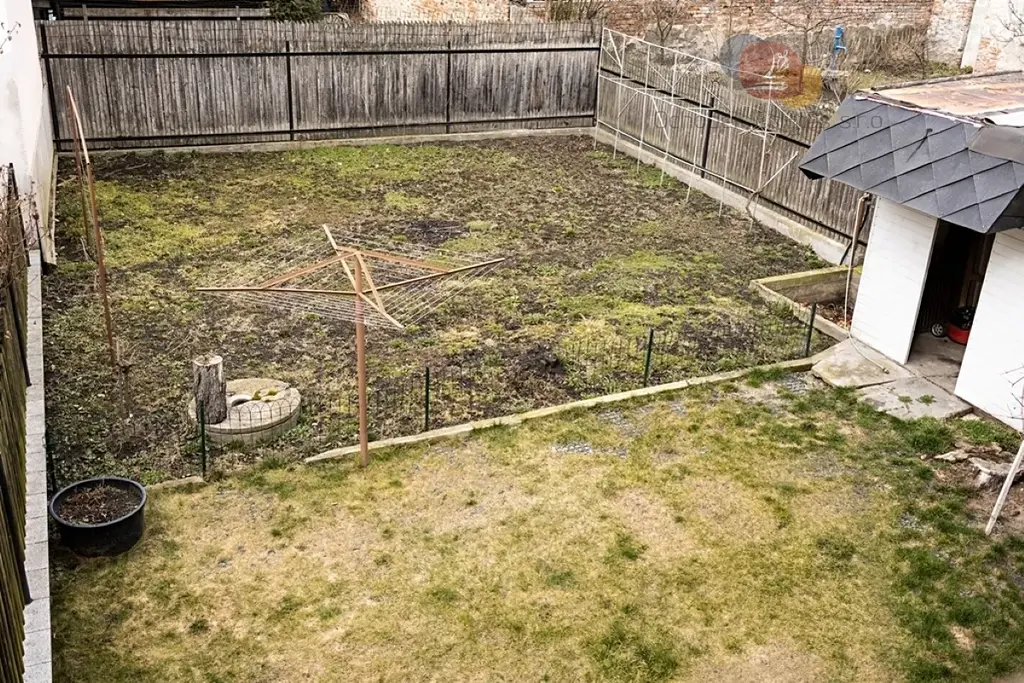 Na zahradě orientované do vnitrobloku je studna k zalévání, vyšší ploty zajišťující soukromí a bouda na zahradní nářadí.