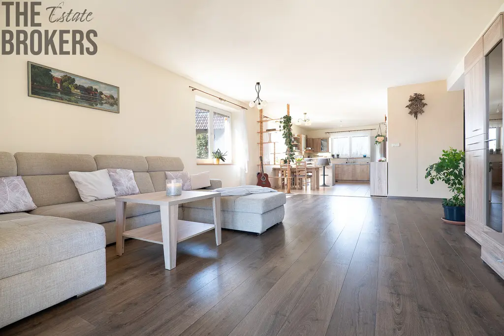 • obývací pokoj propojený s kuchyní, jídelním koutem a spíží