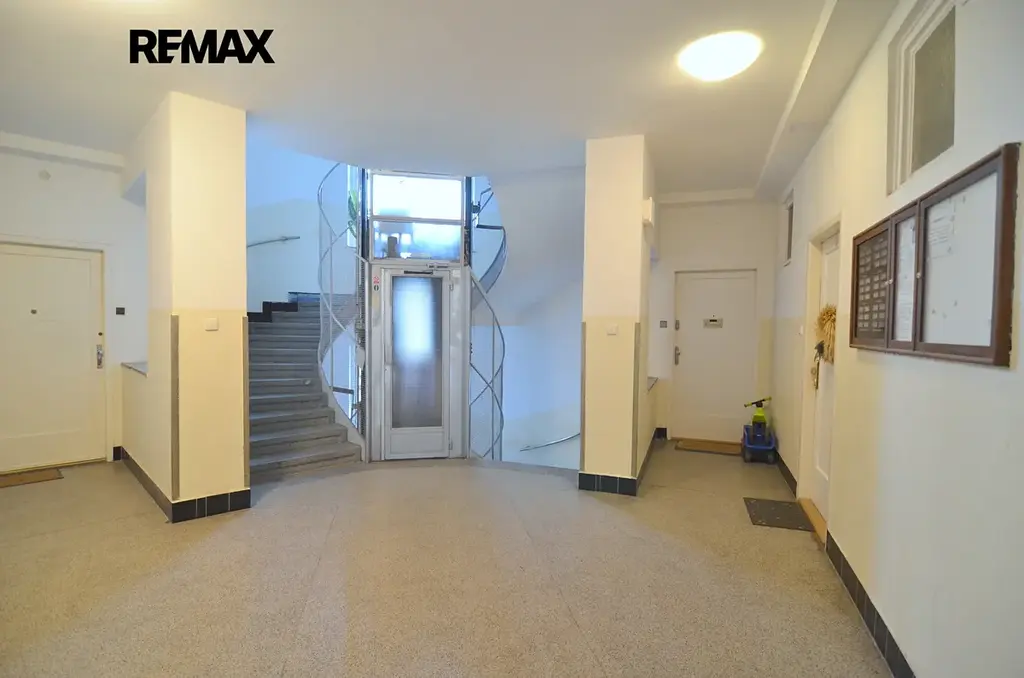 Byt je vytápěn radiátory a plynovým kotlem. Na podlahách jsou parkety a plovoucí podlaha. V koupelně a na WC je pak dlažba. Okna jsou dřevěná špaletová, nad okny jsou garnyže na záclony či závěsy. K bytu přísluší prostorná sklepní kóje (4 m2), kam se vejdou pohodlně i 4 jízdní kola a další věci. K dispozici je v mezipatře lodžie s možností sušení prádla. V domě je výtah.