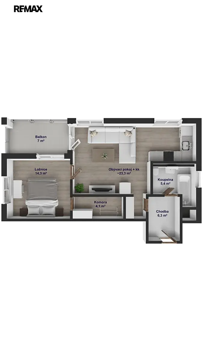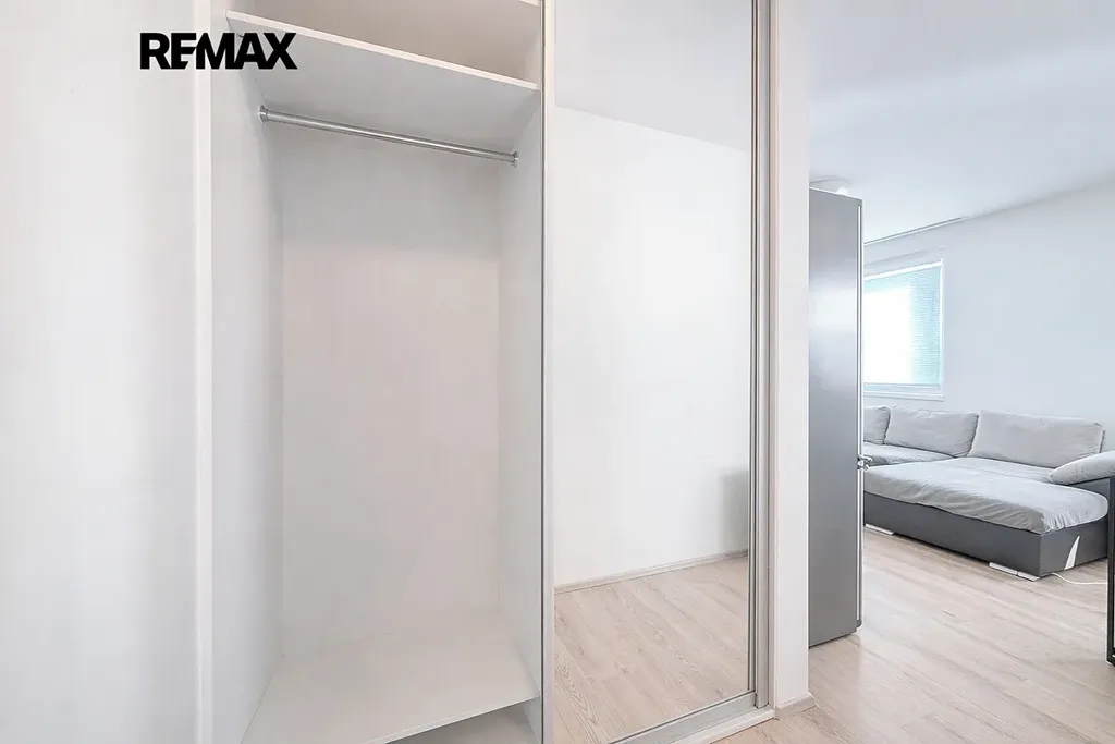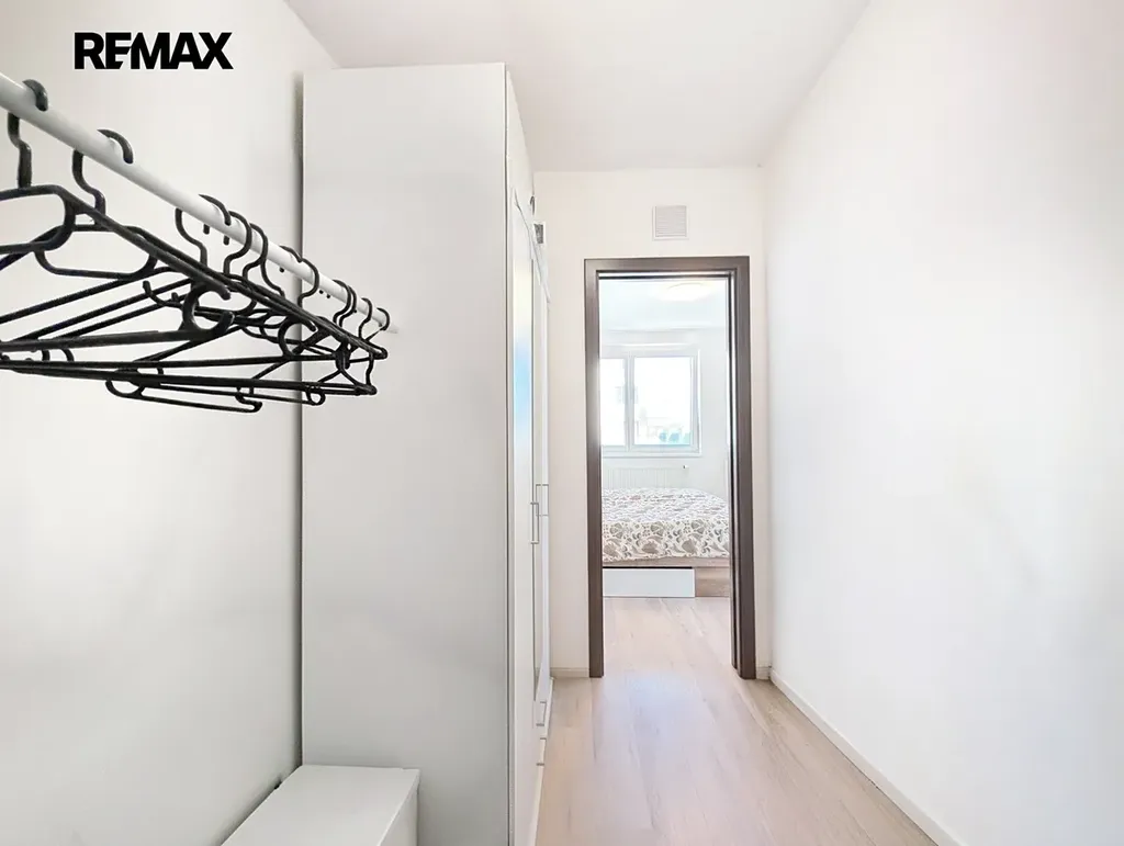 Dispozice je řešena velmi efektivně – obývací pokoj s kuchyňským koutem a přímým vstupem na balkón, samostatná ložnice s přístupem do šatny, prostorná chodba a koupelna s vanou. Velkým benefitem jsou úložné prostory řešené na míru, které dávají bytu nadstandardní funkčnost pro každodenní život. Díky orientaci na více světových stran (jih, východ, západ) je byt přirozeně světlý a vzdušný po celý den.