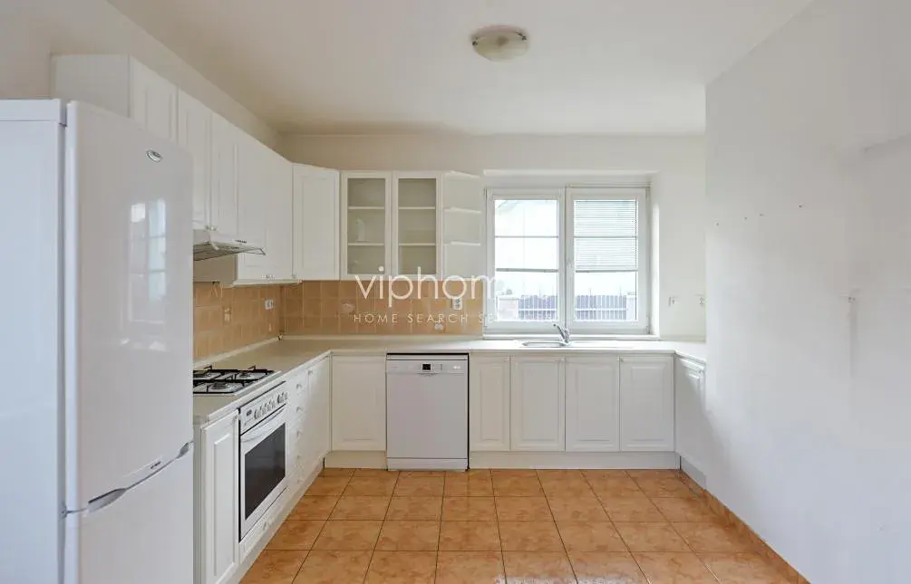 Interiér domu nabízí velký obývací pokoj (50 m2) s krbem, jídelnu, kuchyň, vstup na terasu a zahradu, koupelnu ze sprchovým koutem a WC, předsíň. Nová kuchyňská linka vybavená veškerým komfortem - myčka nádobí, vestavěná varná deska, vestavěná elektrická trouba, odsavač par, lednice s mrazákem. V prvním patře jsou čtyři ložnice, plně vybavena koupelna (sprchový kout/vana/WC) a centrální hala. V suterénu je umístěna prádelna a technické zázemí. K dalšímu vybavení patří elektronické zabezpečovací zařízení napojené na PCO, parkety, obklady a dlažby, vestavěné skříně v předsíni, satelitní TV připojení. Garáž pro dva vozy. Zálohy na služby a spotřebu energií včetně údržby zahrady cca 10 000 Kč/měsíčně. K dispozici od 15.5.2026