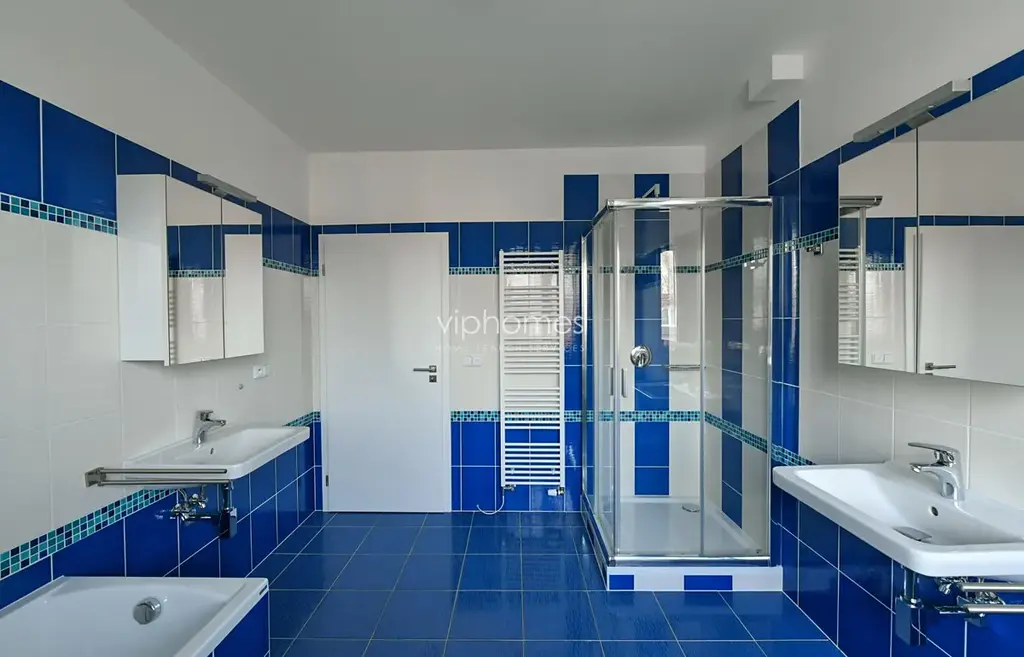 Třípodlažní dům má celkem 5 ložnic a 3 koupelny. Hlavní obytný prostor tvoří obývací pokoj s krbem a plně vybavenou kuchyní, (myčka nádobí, vestavěná varná deska, vestavěná elektrická trouba, odsavač par, lednice s mrazákem), ložnice pro hosty / pracovna, koupelna s vanou, sprchovým koutem, toaletou, samostatné WC s bidetem a vstupní hala. Z obývacího pokoje je vstup na zahradu. V patře jsou umístěny 4 prostorné ložnice, 2 koupelny. Suterén: prádelna, technické zázemí, 1 hobby místnost.