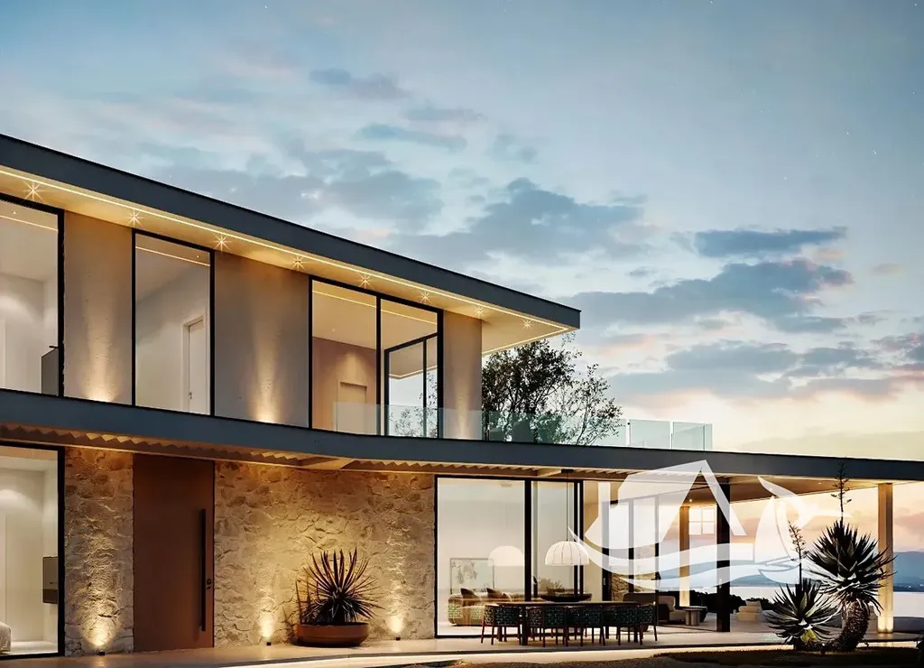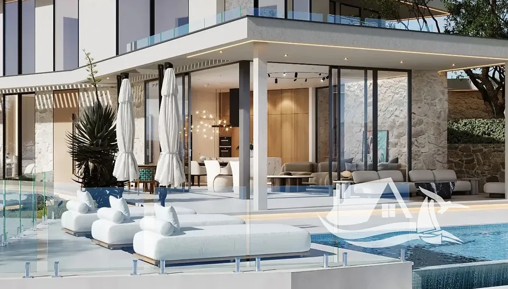 Dominantou exteriéru je soukromý bazén obklopený prostornou zahradou, ideální pro relaxaci i soukromé chvíle v přírodě. Díky vyvýšené poloze nabízí vila nerušené panoramatické výhledy na moře a okolní krajinu.