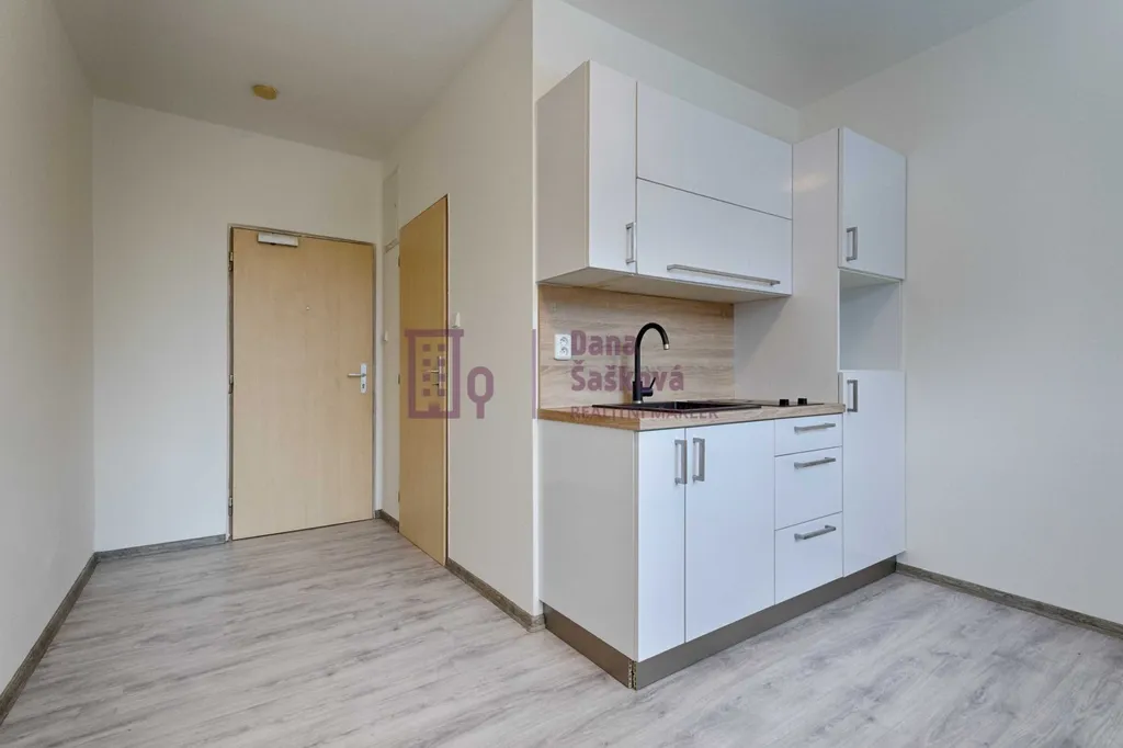 Dispozice nabízí pokoj s kuchyňským koutem a koupelnu s vanou a toaletou.