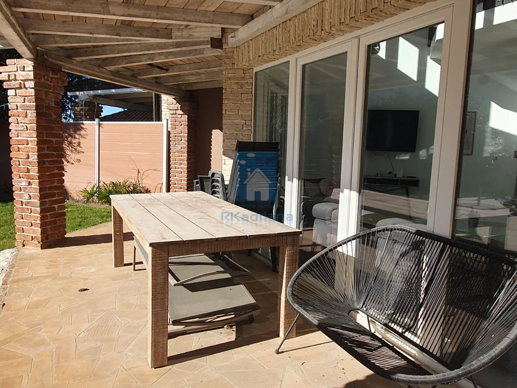 Z obývacího pokoje je vstup na velkou terasu krytou pergolou o rozloze cca 20 m2. V rohu dvora se nachází letní kuchyně. Dům je orientován na jih a má velké, světlé prosklené otvory. V obývacím pokoji je otevřený krb. Vzdálenost od centra města je pouze 900 m a asi 12 km od moře.