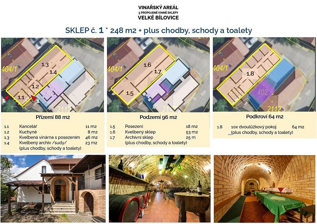 Nabízený objekt tří vzájemně propojených vinných sklepů nabízí více než 500 m² užitné plochy. Najdete zde nejen sedm kvelbených sklepů různých velikostí s více než stovkou míst k posezení, ale také kuchyni, kanceláře, sklepní prostory se stovkami nejrůznější nádob i archivních boxů. V horních podlažích je rovněž řada skladů s místy pro uskladnění vinařského vybavení a strojů a v podkroví jednoho ze sklepů se nabízí dokonce možnost ubytování až pro 20 osob.