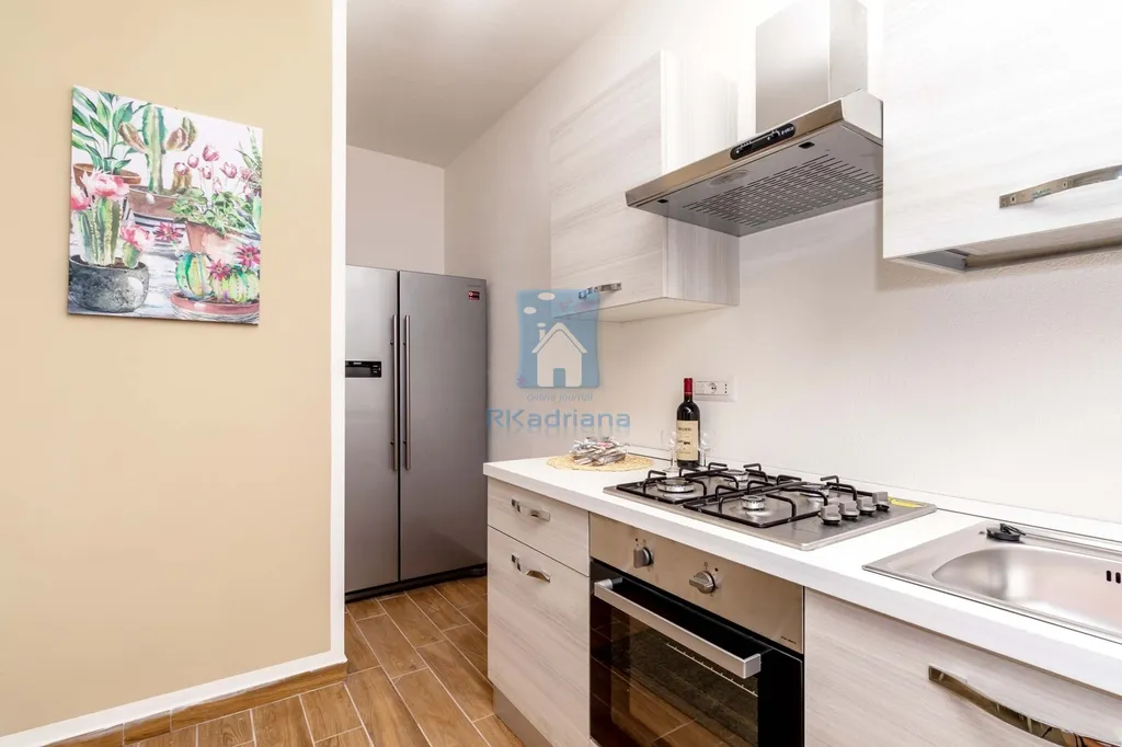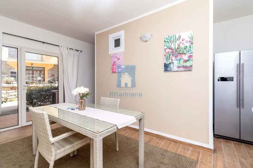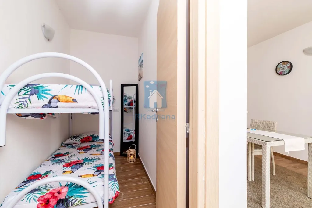 Byt je prakticky dispozičně řešen a nabízí jídelnu s jídelním stolem a kuchyňským koutem vybaveným kuchyňskou linkou, ledničkou, kombinovaným sporákem a digestoří. Dále zde najdete ložnici s manželskou postelí a úložnými poličkami, menší pokoj s palandami a koupelnu se sprchovým koutem, umyvadlem, pračkou, toaletou a bidetem. Součástí je také venkovní terasa.