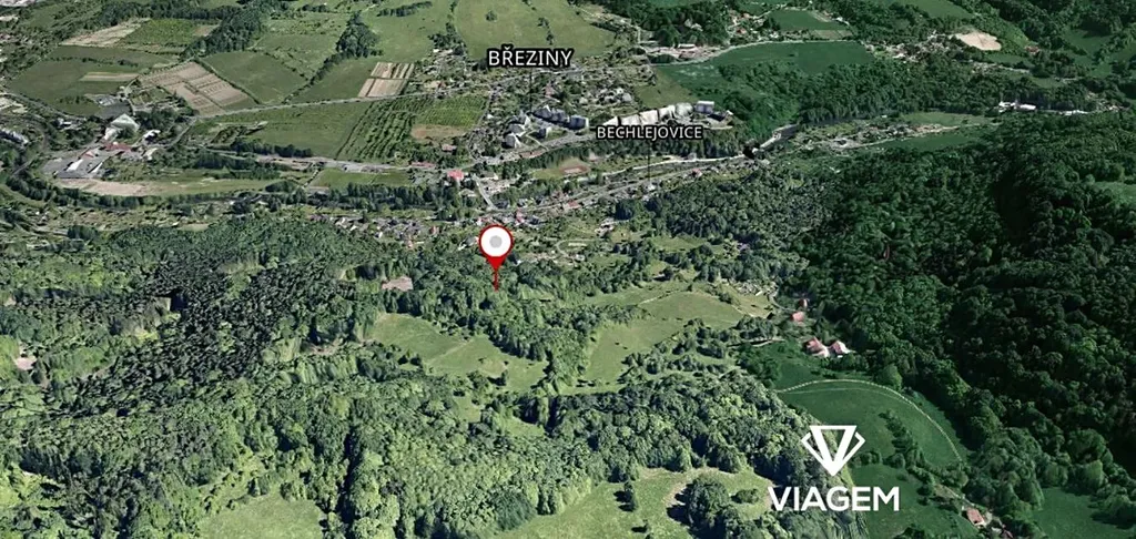 Pozemek se nachází v blízkosti rodinných domů a místních lesů.