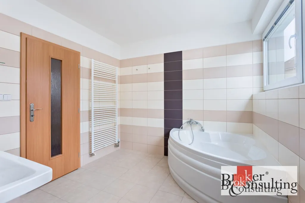 V prvním patře je koupelna s vanou, sprchovým koutem a odděleným WC.
