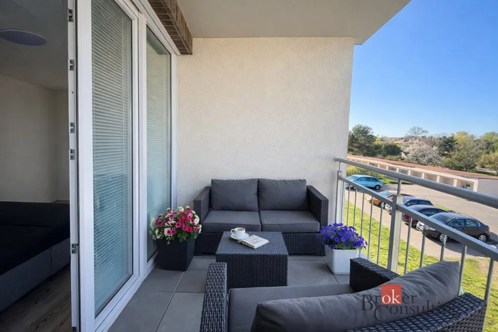 Dominantou bytu je obývací pokoj s kuchyňským koutem vybaveným moderní kuchyňskou linkou se spotřebiči. Samostatná ložnice poskytuje dostatek soukromí a prostoru pro pohodlné bydlení. Velkým benefitem je lodžie, která je přístupná z obytné části. Další francouzská okna se zábradlím (tzv. francouzský balkon) zajišťují dostatek denního světla a příjemné provětrání bytu. Koupelna je vybavena vanou a připravena pro umístění pračky. Byt působí velmi světlým a vzdušným dojmem díky velkým proskleným plochám.