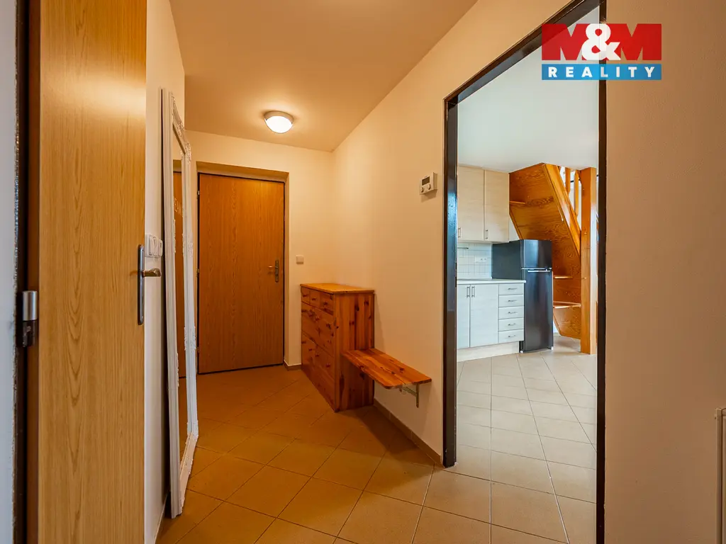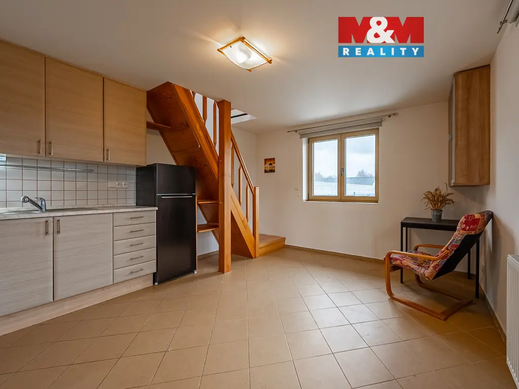Nabízíme k pronájmu velmi hezký mezonetový byt, v přízemí se nachází samostatná koupelna s wc, obývací pokoj s kuchyňským koutem a vstupem do prostorné garáže. Po dřevěných schodech vstoupíte do útulného podkrovního pokoje. K dispozici je nájemníkům i část zahrady. Celkový prostor této samostatné bytové jednotky je umístěn v okrasné a krásně udržované zahradě, s možností odpočinku a grilování. K dispozici je nadstandardně velká garáž pro jedno vozidlo a současně úložný prostor pro sportovní vybavení.