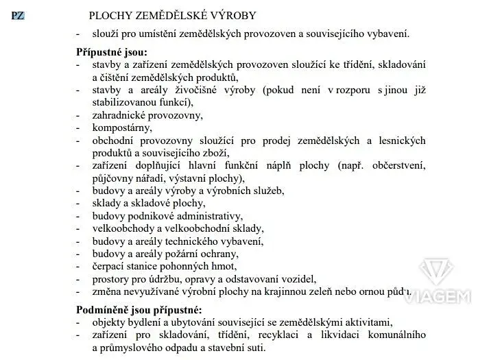 Pozemek je územním plánem veden jako Plochy zemědělské výroby, přípustné konkrétně na: