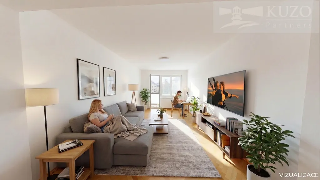 Důležité k fotodokumentaci: Fotografie označené nápisem „VIZUALIZACE“ slouží pro lepší představu o možnostech uspořádání nábytku. Ostatní fotografie věrně zachycují aktuální, nově dokončený stav bytu.