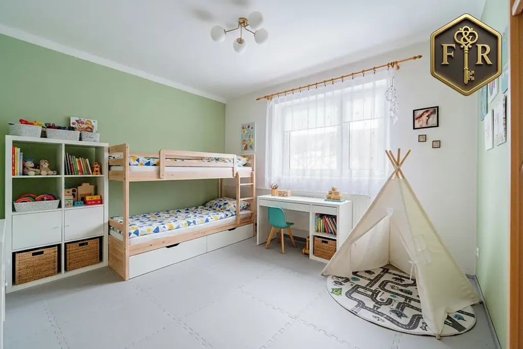 Dispozice domu je 5+kk (PP: sklady, kotelna; 1.NP: 2 pokoje, kuchyně, koupelna, WC; Podkroví: 3 pokoje, kuchyňský kout, balkon, WC)