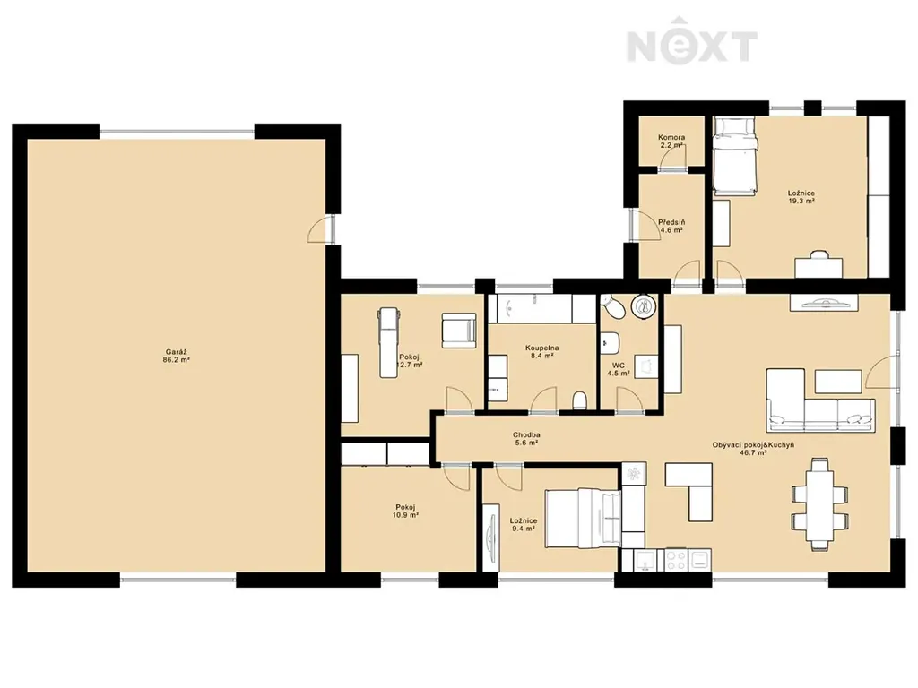 Dům má zastavěnou plochu 216 m². Po vstupu se nachází zádveří se samostatnou šatnou, odkud vede vstup do velmi prostorného obývacího pokoje s velkými francouzskými okny orientovanými do zahrady. Obývací pokoj je propojen s kuchyní, která nabízí dostatek úložného prostoru, vestavnou myčku, elektrickou troubu, mikrovlnnou troubu, indukční varnou desku i lednici. Celý interiér působí vzdušně, je plný přirozeného světla a nabízí příjemnou domácí atmosféru. Z obývacího pokoje lze vstoupit do dětského pokoje.