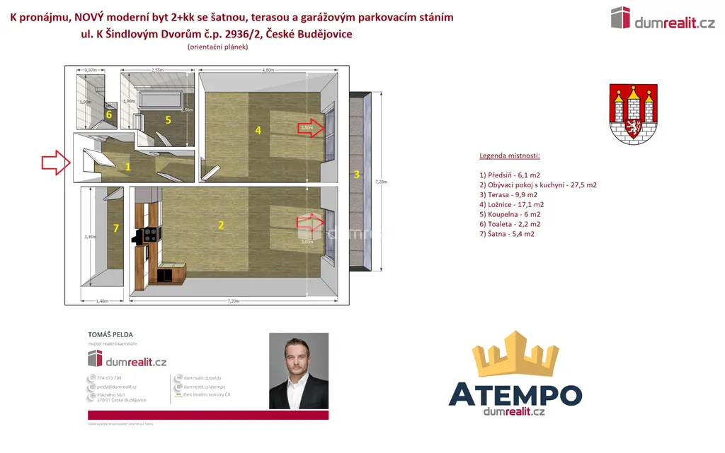 Dumrealit.cz Vám zprostředkuje pronájem NOVÉHO moderního bytu 2+kk ve vysokém standardu s vysokými stropy, šatnou, samostatnou toaletou, terasou a krytým garážovým stáním v novostavbě bytového domu v nové ulici K Šindlovým Dvorům č.p. 2936/2 na okraji města České Budějovice. Bytová jednotka se nachází ve 4. patře a je situována na západní světovou stranu. Okna bytu jsou vybaveny venkovními předokenními žaluziemi. V bytě je nová kuchyňská linka s vestavěnými spotřebiči. V obytných místnostech jsou velké prosklené dveře, přes které se dostaneme na prostornou terasu. Podrobné rozkreslení dispozice naleznete na orientačním plánku mezi fotografiemi. Nájemné bytu činí 19.000,-Kč měsíčně + poplatky výši 3.800,-Kč pro 2 osoby + kryté garážové stání za 1.500,-Kč. K dispozici ihned. Hledáme dlouhodobé a solidní nájemníky. Více informací Vám poskytne realitní makléř Tomáš Pelda z realitní kanceláře A TEMPO fungující pod ochrannou známkou dumrealit.cz. Ev. číslo: 655334.