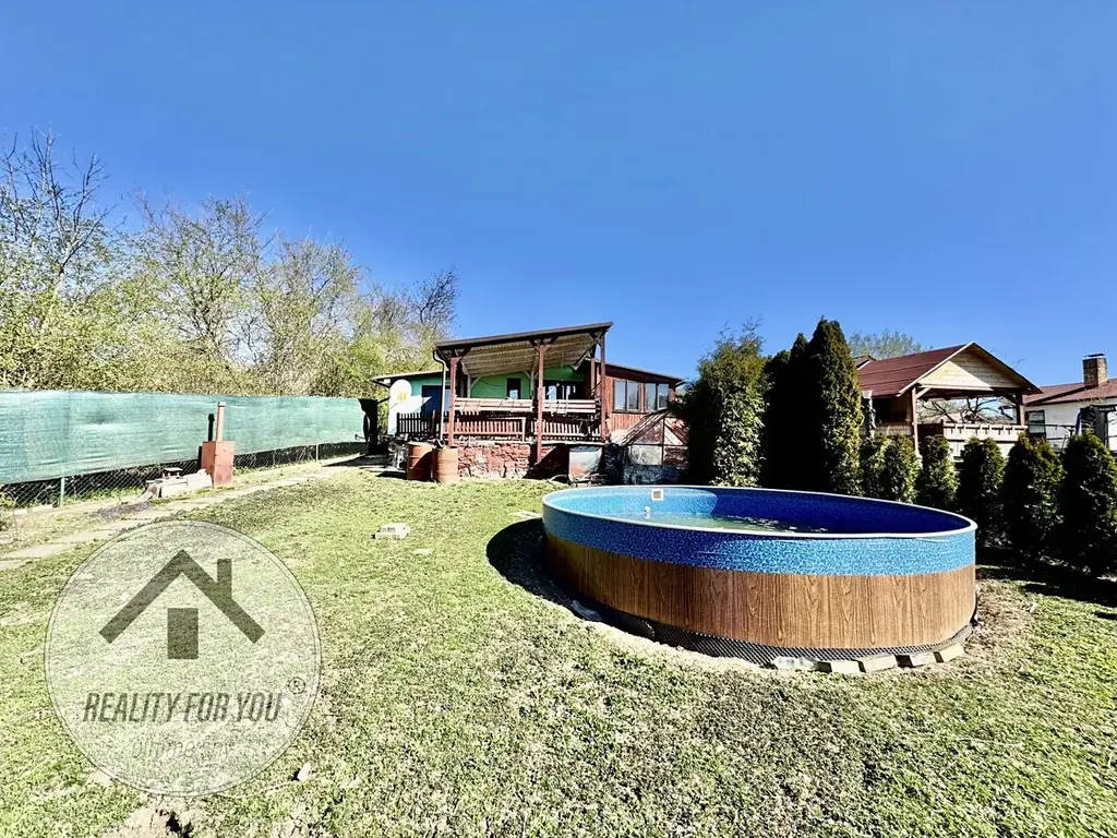 Dominantou lehce svažitého pozemku je bazén o objemu cca 25 m³ s pískovou filtrací – ideální pro letní relaxaci.