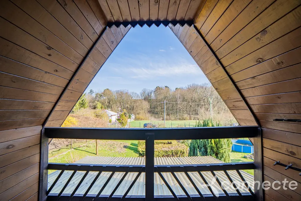 Chata nabízí obývací pokoj, menší kuchyňku a v patře ložnici. Z ložnice je vstup na balkon s výhledem do zahrady a na les na protější straně údolí. Příjemným bonusem je prostorná terasa a zastřešené posezení přímo před chatou.