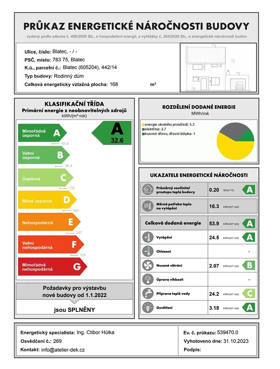 Tento dům je nejen skvělou investicí, ale také komfortním místem pro váš nový domov. Energetická třída A zaručuje nízkoenergetický provoz, což je výhodné pro dlouhodobé udržitelné bydlení.