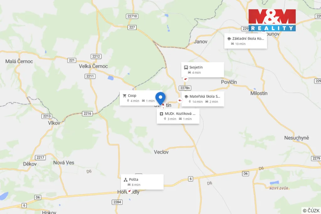 Nabízíme k prodeji soubor pozemků o celkové výměře 17 686 m² v obci Svojetín na Rakovnicku. Pozemky nabízejí možnost vybudování příjezdových cest z obou stran, což zajišťuje velmi dobrou dostupnost a zároveň zajímavý potenciál pro budoucí využití či případné rozdělení. Součástí prodeje je také chalupa stojící na jednom z pozemků. Na pozemku je k dispozici připojení na elektřinu, vodu i kanalizaci. Svojetín se nachází v tradiční chmelařské oblasti s historií sahající až do roku 1250, což dodává lokalitě jedinečný venkovský charakter a atmosféru. Lokalita je klidná a vhodná jak pro rekreaci, tak jako investice. Pro více informací nás neváhejte kontaktovat.
