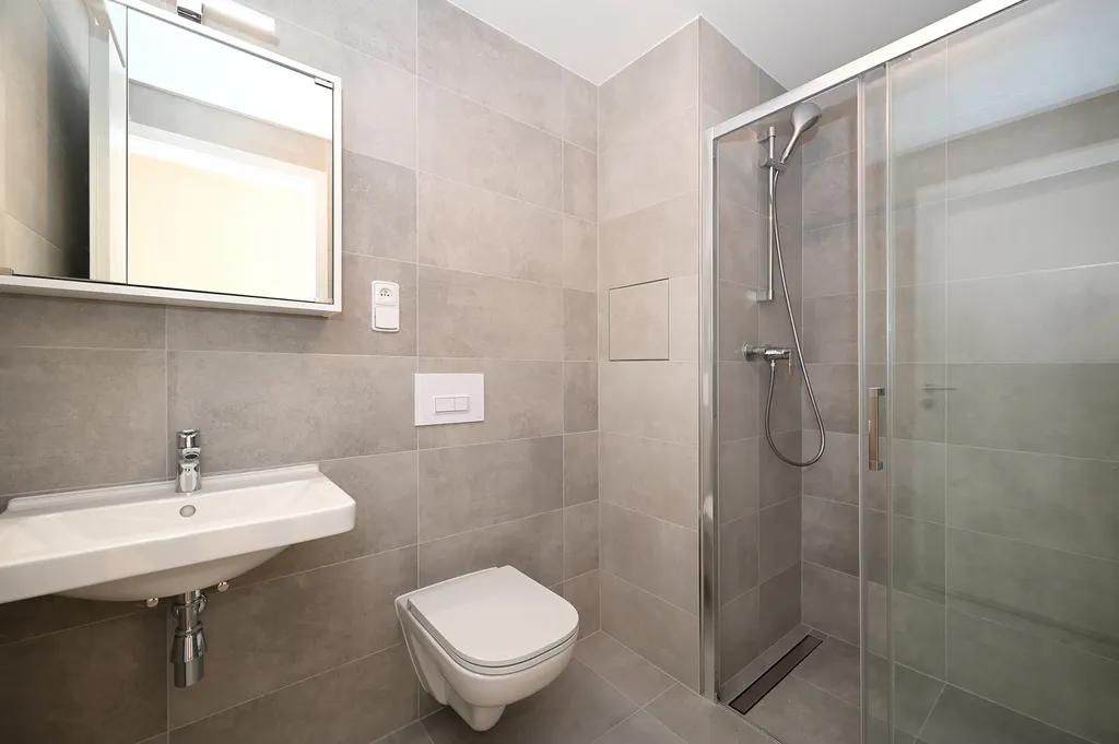 Koupelna nabízí sprchový kout, závěsné WC a umyvadlo se skříňkou a působí velmi čistým a moderním dojmem.