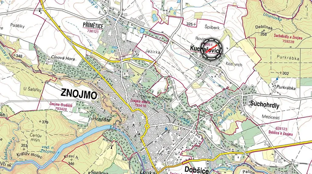 V katastrálním území Kuchařovice, okres Znojmo, nabízíme k prodeji soubor navazujících pozemků tvořících jeden hospodářský celek o celkové výměře 5 868 m². Pozemky jsou ve výlučném vlastnictví a zapsány na LV č. 1270.