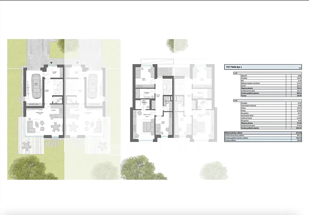 Vila 1 bude součástí moderního dvojdomu umístěného na pozemcích – parc. č. 3841/360 o výměře 719 m² a 3841/301 o výměře 301 m², takže nabídne dostatek soukromí i prostoru pro rodinný život. Zahrada orientovaná na jih zajistí slunce po celý den a příjemné posezení na terase. Výstavba začíná v dubnu 2026.