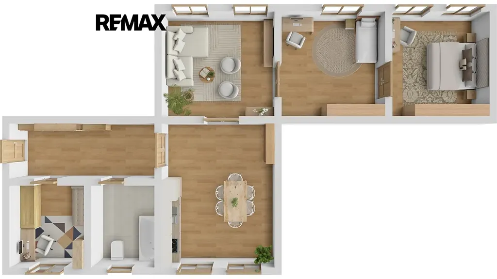 Z prostorné vstupní chodby je samostatný vstup do menšího pokoje, koupelny (určené k rekonstrukci) a kuchyně, která již prošla rozsáhlou modernizací včetně nových elektrických rozvodů. Z kuchyně se plynule dostanete do obývacího pokoje, na který navazují další dva pokoje, ideální jako ložnice či dětské pokoje. V ostatních částech bytu jsou rozvody elektřiny v hliníku.