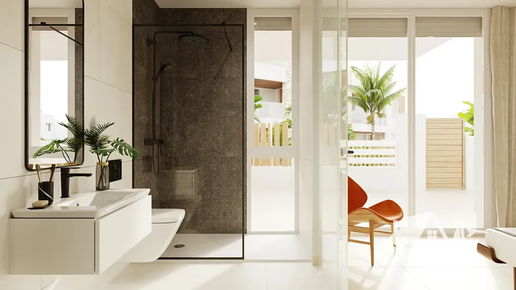 Interiéry jsou vyvedené v prvotřídním standardu, porcelánová dlažba dodává eleganci a dlouhodobou odolnost, elektrické rolety a videotelefon zvyšují pohodlí a bezpečnost a vestavěné skříně udržují domov přehledný a organizovaný. Rezidenční komplex doplňují pečlivě řešené společné prostory s rozlehlými zahradními plochami a sdíleným bazénem, které rozšiřují možnosti volnočasového vyžití a rodinné pohody.