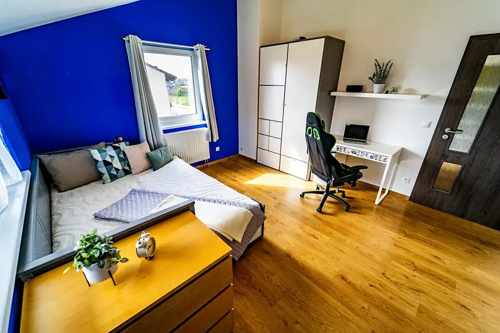 V přízemí se nachází prostorný obývací pokoj propojený s kuchyňským koutem, ložnice, koupelna se sprchovým koutem a vstupní hala. V patře naleznete tři samostatné pokoje, toaletu a koupelnu s vanou.