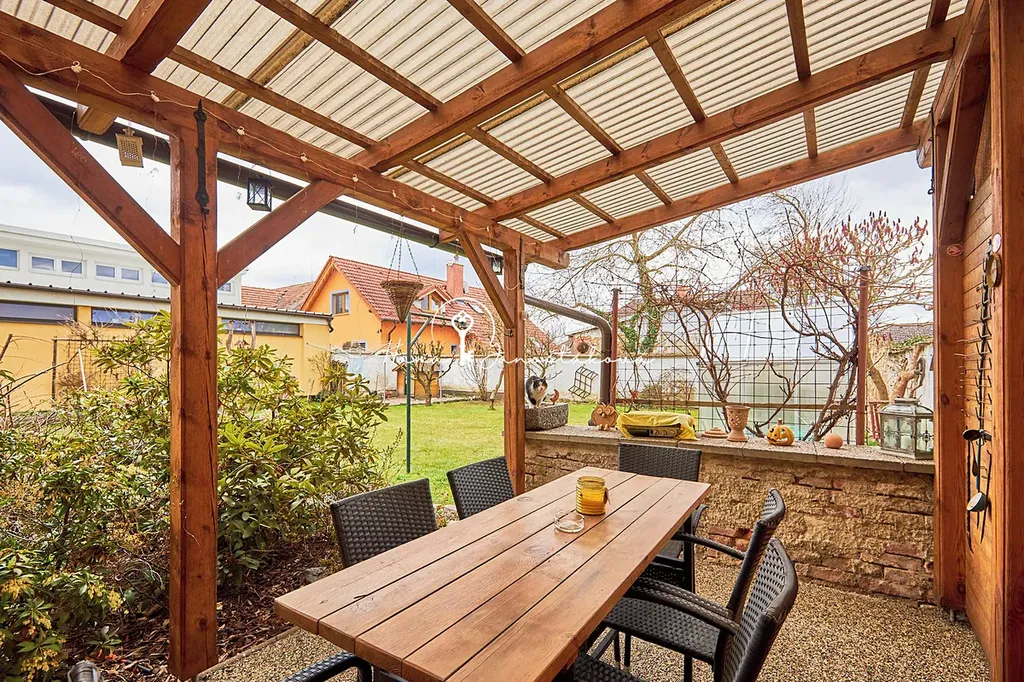 Součástí nemovitosti je udržovaná zahrada s krytou pergolou a příjemným posezením a dále garáž, která poskytuje pohodlné parkování. Další možnost parkování je přímo před domem.