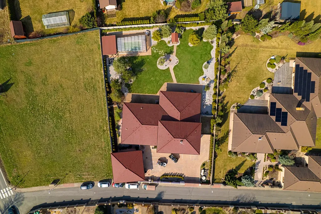 Celý areál se nachází na rovinatém pozemku o velikosti 2 077 m² a je koncipován jako uzavřený celek tvořený třemi samostatnými budovami – hlavním rodinným domem o velikosti 350 m², samostatným hostovským domem s wellness a bazénem a dvoupodlažní garáží s dílnou a kompletním zázemím. Díky tomuto uspořádání nabízí nemovitost maximální soukromí i variabilitu využití.