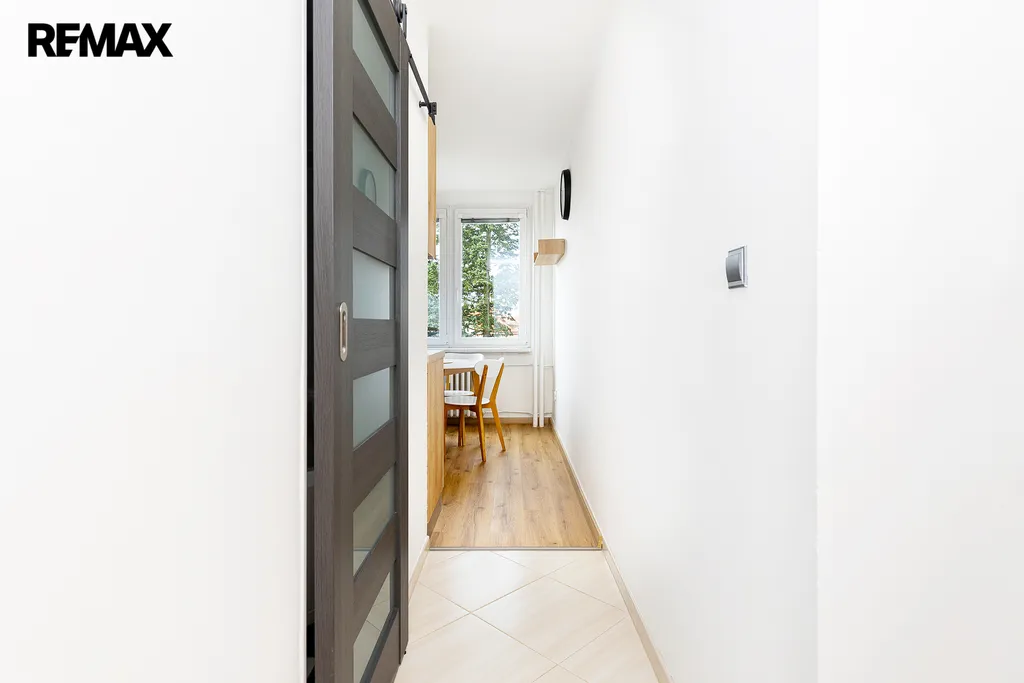 Byt se prodává částečně vybavený — zůstává komora v předsíni, kuchyňský stůl a židle.