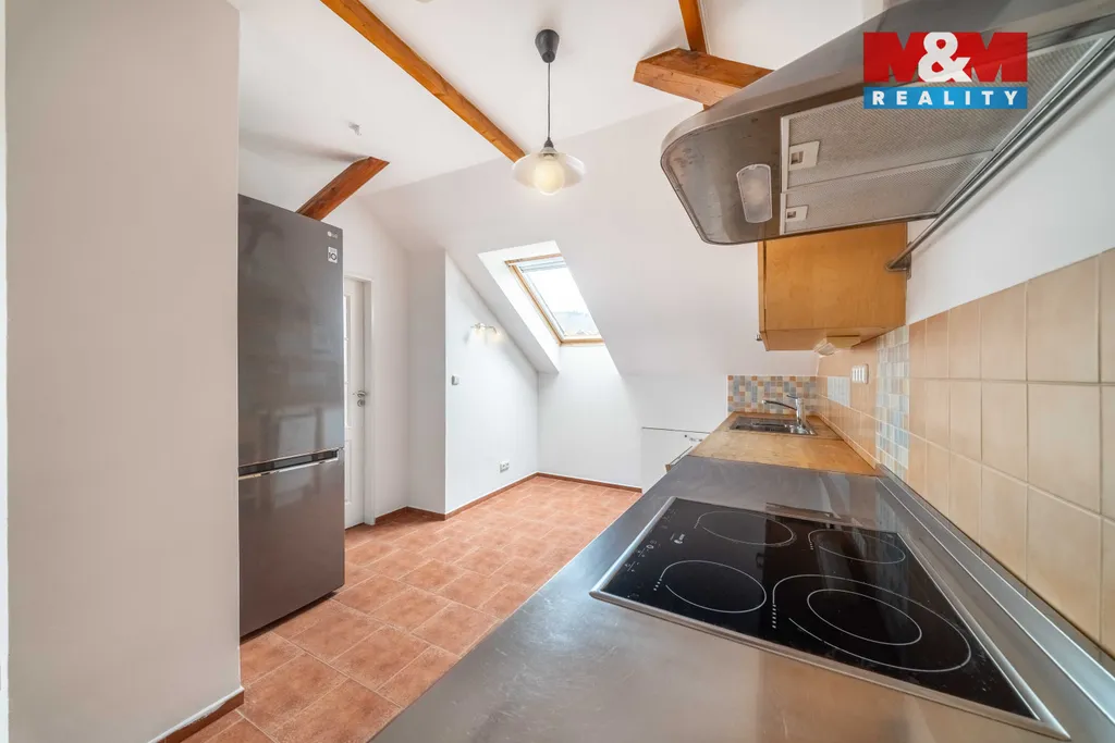 Prodej prostorného podkrovního bytu 1+kk o celkové ploše 55 m² v osobním vlastnictví, situovaný ve 3. patře cihlového domu bez výtahu v klidné části Mníšku pod Brdy, ul. 5. května. Byt vznikl jako půdní vestavba a nabízí otevřený obytný prostor o velikosti 42,39 m² a nadstandardně velkou koupelnu (13,11 m²).