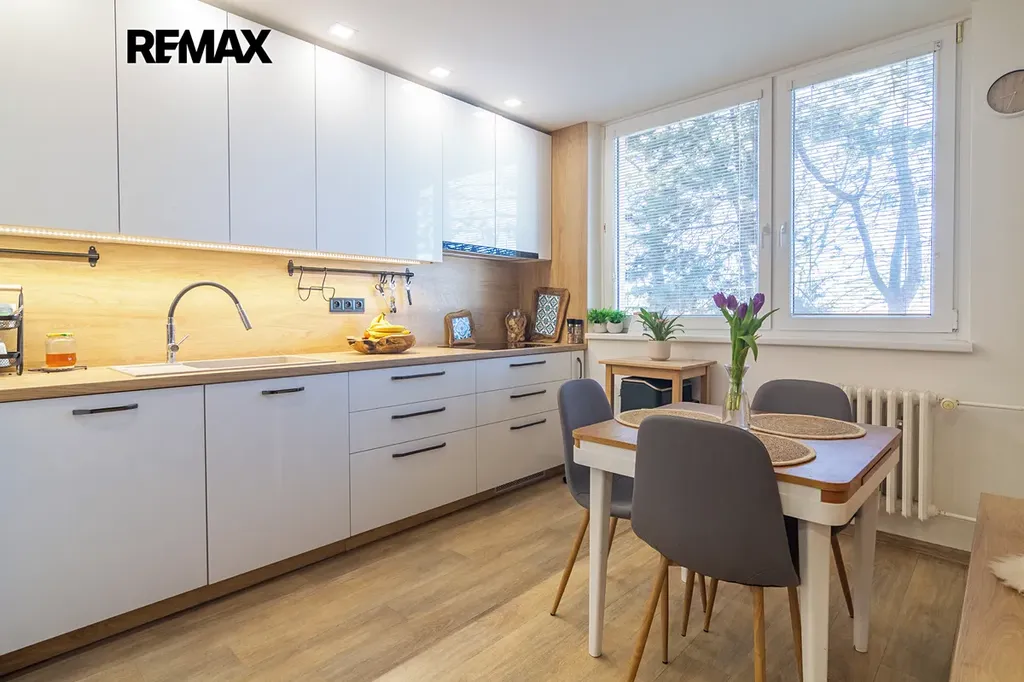 Byt prošel v nedávné době rekonstrukcí. Má nové rozvody elektřiny, zděnou koupelnu s vanou, plovoucí podlahy a hlavně na míru zhotovenou kuchyňskou linku s vestavěnými spotřebiči - myčka, indukce, lednice s mrazákem, mikrovlnka, trouba, digestoř, která je chloubou celého bytu. Byt nabízí také dostatek úložného prostoru - vestavěné skříně v pokojích, na chodbě. Byt se nabízí pouze částečně zařízený - jídelní stůl s židlemi, komoda v ložnici, knihovnička a police v dětském pokoji.