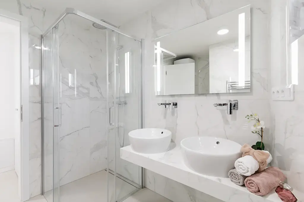 - Nízkoteplotní podlahový systém doplněný o el. topné žebříky v koupelnách